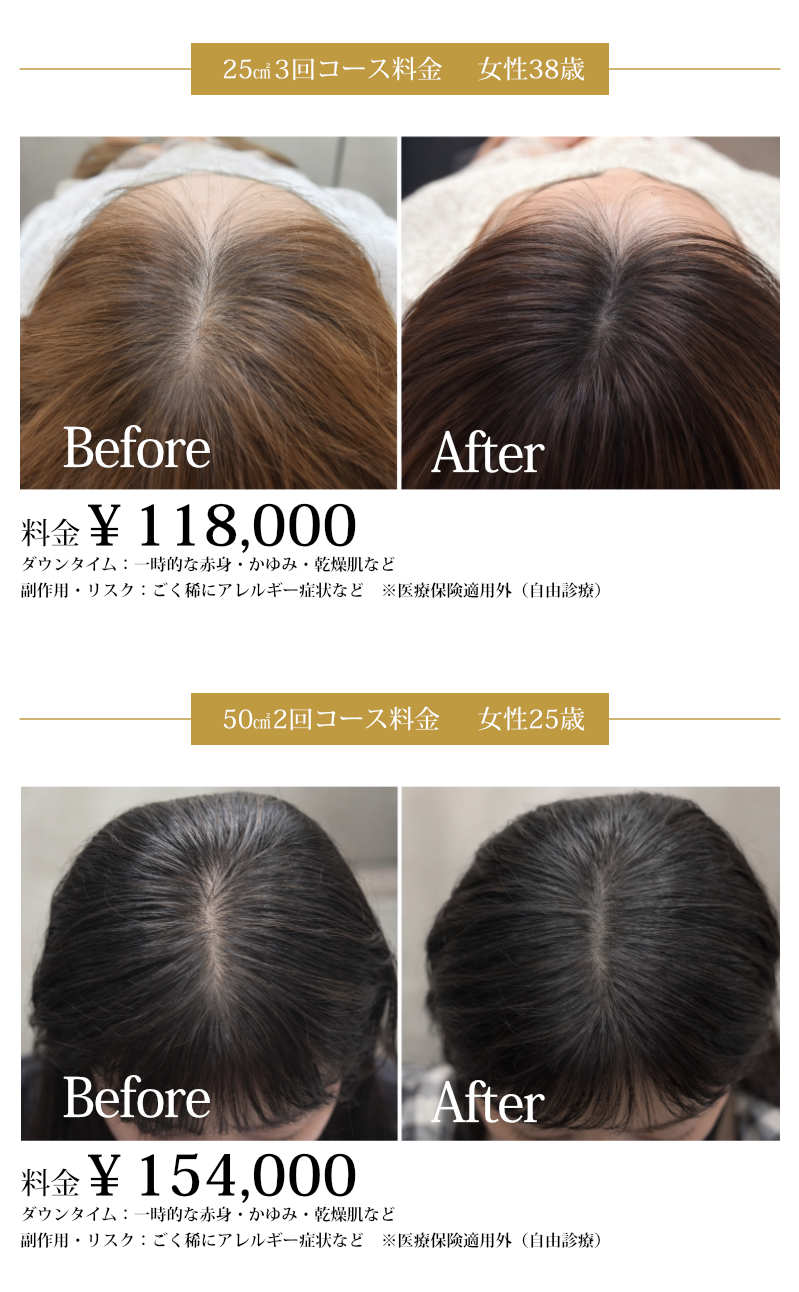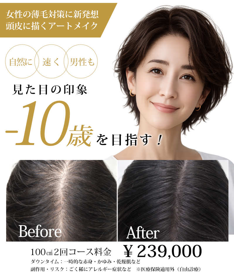 | ヘアーアートメイク | メスを使わず、頭皮に色素を入れる美容施術。ダウンタイムは少なく、数年で薄まるためメンテナンスが必要です。 |